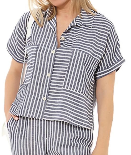 Blusa de rayas con bolsillos en el pecho y cierre de botones con manga corta y corte holgado.